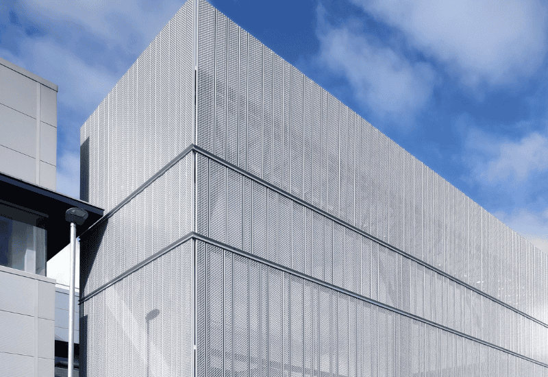 Mesh rainscreens provide a striking alternative to traditional panels. The open weave allows airflow and light movement while adding strong visual texture and transparency to the building exterior.